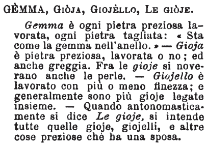 | Gemma, Gioja, Giojello, Le gioje - Gemma è ogni pietra preziosa lavorata, ogni pietra tagliata: «Sta come la gemma nell'anello.» - Gioja è pietra preziosa, lavorata o no; ed anche greggia. Fra le gioje si noverano anche le perle. - Giojello è lavorato con più o meno finezza; e generalmente sono più gioje legate insieme. - Quando antonomasticamente si dice Le gioje, si intende tutte quelle gioje, giojelli, e altre cose preziose che ha una sposa. [immagine] |