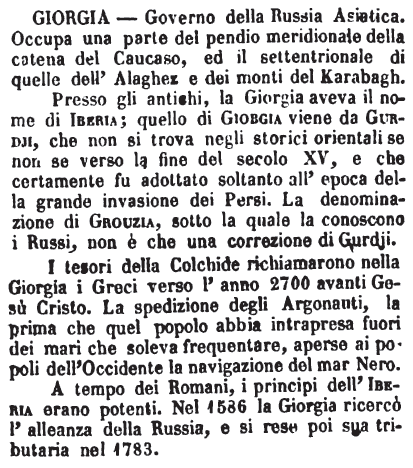 Presso gli antichi, la Giorgia aveva il nome di Iberia; quello di Giorgia viene da Gurdji, che non si trova negli storici orientali se non se verso la fine del secolo XV, e che certamente fu adottato soltanto all'epoca della grande invasione dei Persi. La denominazione di Grouzia, sotto la quale la conoscono i Russi, non è che una correzione di Gurdji.