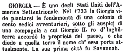 | Giorgia - E' uno degli Stati Uniti dell'America Settentrionale. Nel 1733 la Giorgia vide piantarsi le fondamenta di una colonia di cento sedici avventurieri, sotto gli auspicj di una compagnia a cui Giorgio II. re d'Inghilterra accordò la proprietà del paese, e che diede a quella terra il nome ch'essa porta attualmente. La sua prima città fu Savannah. [immagine] |