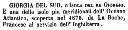 | Giorgia del sud - o Isola del re Giorgio. E' una delle isole più meridionali dell'Oceano Atlantico, scoperta nel 1675. da La Roche, Francese al servizio dell'Inghilterra. [immagine] |