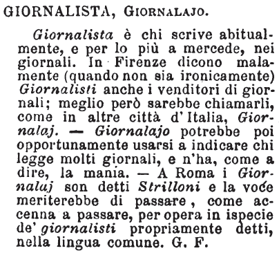| Giornalista, Giornalajo - Giornalista è chi scrive abitualmente, e per lo più a mercede, nei giornali. In Firenze dicono malamente (quando non sia ironicamente) Giornalisti anche i venditori di giornali; meglio però sarebbe chiamarli, come in altre città d'Italia, Giornalaj. - Giornalajo potrebbe poi opportunamente usarsi a indicare chi legge molti giornali, e n'ha, come a dire, la mania. - A Roma i Giornalaj son detti Strilloni e la voce meriterebbe di passare, come accenna a passare, per opera in ispecie de' giornalisti propriamente detti, nella lingua comune. G. F. [immagine] |