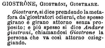 | Giostrone, Giostroni, Giostrare - Giostrare, si dice prendendo la metafora da' giostratori odierni, che spesso girano e girano attorno senza proposito; e più spesso si dice Andare giostroni, chiamandosi Giostrone la persona che va così attorno ozieggiando. [immagine] |