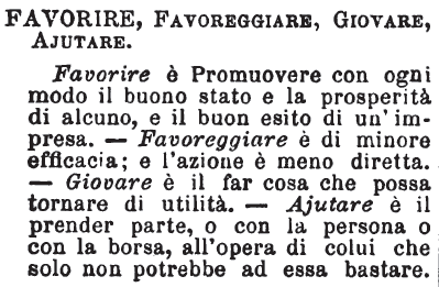 | Favorire, Favoreggiare, Giovare, Ajutare - Favorire è Promuovere con ogni modo il buono stato e la prosperità di alcuno, e il buon esito di un'impresa. - Favoreggiare è di minore efficacia; e l'azione è meno diretta. - Giovare è il far cosa che possa tornare di utilità. - Ajutare è il prender parte, o con la persona o con la borsa, all'opera di colui che solo non potrebbe ad essa bastare. [immagine] |