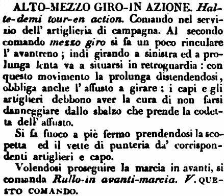 | Alto - Mezzo giro - In azione - Halte-demi tour-en action. Comando nel servizio dell'artiglieria di campagna. Al secondo comando mezzo giro si fa un poco rinculare l'avantreno; indi girando a sinistra ed a prolunga lenta va a situarsi in retroguardia: con questo movimento la prolunga distendendosi, obbliga anche l'affusto a girare; i capi e gli artiglieri debbono aver la cura di non farsi danneggiare dallo sbalzo che prende la codetta dell'affusto.