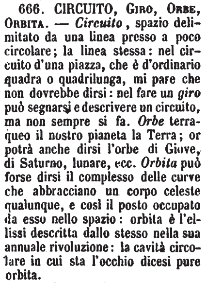 | Circuito, Giro, Orbe, Orbita - Circuito, spazio delimitato da una linea presso a poco circolare; la linea stessa: nel circuito d'una piazza, che è d'ordinario quadra o quadrilunga, mi pare che non dovrebbe dirsi: nel fare un giro può segnarsi e descrivere un circuito, ma non sempre si fa. Orbe terraqueo il nostro pianeta la Terra; or potrà anche dirsi l'orbe di Giove, di Saturno, lunare, ecc. Orbita può forse dirsi il complesso delle curve che abbracciano un corpo celeste qualunque, e così il posto occupato da esso nello spazio: orbita è l'ellissi descritta dallo stesso nella sua annuale rivoluzione: la cavità circolare in cui sta l'occhio dicesi pure orbita. [immagine] |