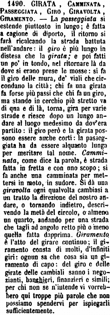 | Girata, Camminata, Passeggiata, Giro, Giravolta, Giramento - La passeggiata si estende piuttosto in lungo; è fatta a cagione di diporto, il ritorno si farà ricalcando la strada battuta nell'andare: il giro è più lungo in distesa che la girata; e poi fatti un po' in tondo, nel ritornare là da dove si erano prese le mosse: si fa il giro delle mura, de' viali che circondano la città; chi fa una girata fa forse più passi che chi fa un giro, ma stando in cerchio più stretto va di qua e di là, torna, gira per varie strade e riesce dopo un lungo andare al luogo medesimo da dov'era partito: il giro però e la girata possono essere anche corti: la passeggiata ha da essere alquanto lunga per meritare tal nome. Camminata, come dice la parola, è strada fatta in fretta e con uno scopo; si fa anche una camminata per mettersi in moto, in sudore. Si dà una giravolta ogni qualvolta cambiasi a un tratto la direzione del nostro andare, o tornando indietro, descrivendo la metà del circolo, o almeno un quarto, andando per una strada che tagli ad angolo retto più o meno quella fatta dapprima. Giramento è l'atto del girare continuo; il giramento consta di molti, d'infiniti giri: ognun sa che cosa sia un giramento di capo: del giro e delle girate delle cambiali sanno i negozianti, banchieri, finanzieri e simili; per chi non se n'intende vi vorrebbero qui troppe più parole che non possiamo spendervi per ispiegarli sufficientemente. [immagine] |