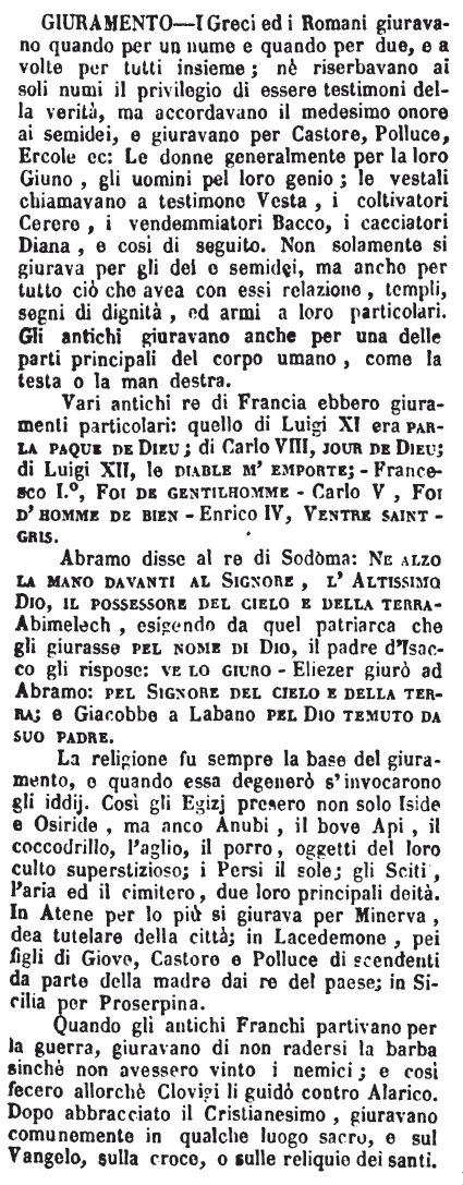 | Giuramento - I Greci ed i Romani giuravano quando per un nume e quando per due, e a volte per tutti insieme; nè riserbavano ai soli numi il privilegio di essere testimoni della verità, ma accordavano il medesimo onore ai semidei, e giuravano per Castore, Polluce, Ercole ec: Le donne generalmente per la loro Giuno, gli uomini pel loro genio; le vestali chiamavano a testimone Vesta, i coltivatori Cerere, i vendemmiatori Bacco, i cacciatori Diana, e così di seguito. Non solamente si giurava per gli dei e semidei, ma anche per tutto ciò che avea con essi relazione, templi, segni di dignità, ed armi a loro particolari. Gli antichi giuravano anche per una delle parti principali del corpo umano, come la testa o la man destra.