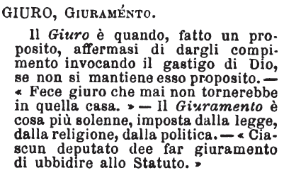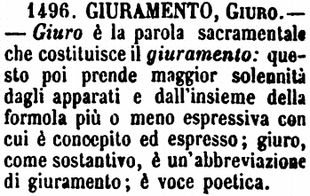 | Giuro, Giuramento - Il Giuro è quando, fatto un proposito, affermasi di dargli compimento invocando il gastigo di Dio, se non si mantiene esso proposito. - «Fece giuro che mai non tornerebbe in quella casa.» - Il Giuramento è cosa più solenne, imposta dalla legge, dalla religione, dalla politica. - «Ciascun deputato dee far giuramento di ubbidire allo Statuto.» [immagine] |