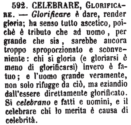 | Celebrare, Glorificare - Glorificare è dare, render gloria; ha senso tutto ascetico, poichè è tributo che ad uomo, per grande che sia, sarebbe ancora troppo sproporzionato e sconveniente: chi si gloria (e gloriarsi è meno di glorificarsi) invero è fatuo; e l'uomo grande veramente, non solo rifugge da ciò, ma eziandio dall'essere direttamente glorificato. Si celebrano e fatti e uomini, e il celebrare chi lo merita è causa di celebrità. [immagine] |