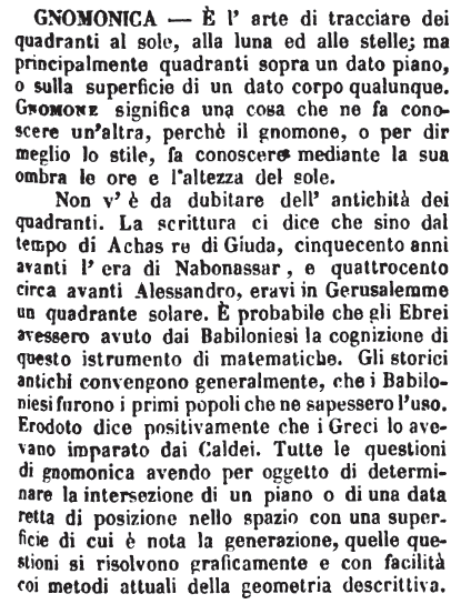 Gnomonica - E' l'arte di tracciare dei quadranti al sole, alla luna ed alle stelle; ma principalmente quadranti sopra un dato piano, o sulla superficie di un dato corpo qualunque. Gnomone significa una cosa che ne fa conoscere un'altra, perchè il gnomone, o per dir meglio lo stile, fa conoscere mediante la sua ombra le ore e l'altezza del sole.