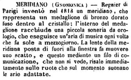 | Meridiano (Gnomonica) - Regnier di Parigi inventò nel 1818 un meridiano, che rappresenta un medaglione di bronzo dorato fuso dentro al cristallo: l'interno del medaglione racchiude una piccola soneria da orologio, che eseguisce un'aria di musica ogni volta che fa sole a mezzogiorno. La lente della meridiana posta di fuori alla finestra fa muovere uno scatto, e questo mediante un filo di comunicazione, che non si vede, risale immediatamente sulle ruote che sul momento suonano le arie adattate. [immagine] |