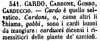 | Cardo, Cardone, Gobbo, Carduccio - Cardo è quello selvatico. Cardoni, o, come altri li chiama, gobbi, sono i cardi buoni da mangiare: carducci diconsi i rimessiticci delle piante de' carciofi. [immagine] |