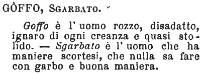 | Goffo, Sgarbato - Goffo è l'uomo rozzo, disadattato, ignaro di ogni creanza e quasi stolido. - Sgarbato è l'uomo che ha maniere scortesi, che nulla sa fare con garbo e buona maniera. [immagine] |