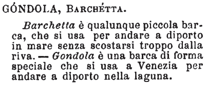 | Gondola, Barchetta - Barchetta è qualunque piccola barca, che si usa per andare a diporto in mare senza scostarsi troppo dalla riva. - Gondola è una barca di forma speciale che si usa a Venezia per andare a diporto nella laguna. [immagine] |