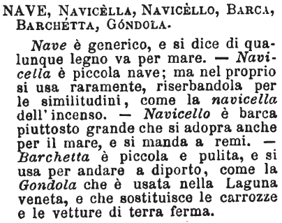 | Nave, Navicella, Navicello, Barca, Barchetta, Gondola - Nave è generico, e si dice di qualunque legno va per mare. - Navicella è piccola nave; ma nel proprio si usa raramente, riserbandola per le similitudini, come la navicella dell'incenso. - Navicello è barca piuttosto grande che si adopra anche per il mare, e si manda a remi. - Barchetta è piccola e pulita, e si usa per andare a diporto, come la Gondola che è usata nella Laguna veneta, e che sostituisce le carrozze e le vetture di terra ferma. [immagine] |
