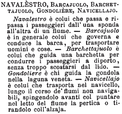 | Navalestro, Barcajuolo, Barchettajuolo, Gondoliere, Navicellajo - Navalestro è colui che passa e ripassa i passeggieri dall'una sponda all'altra di un fiume. - Barcajuolo è in generale colui che governa e conduce la barca, per trasportare uomini e cose. - Barchettajuolo è colui che guida una barchetta per condurre i passeggieri a diporto, senza troppo scostarsi dal lido. - Gondoliere è chi guida la gondola nella laguna veneta. - Navicellajo è colui che trasporta nel navicello, lungo il corso de' fiumi non navigabili, spingendolo avanti col puntare nel letto del fiume la pertica o tirandolo coll'alzaja. [immagine] |