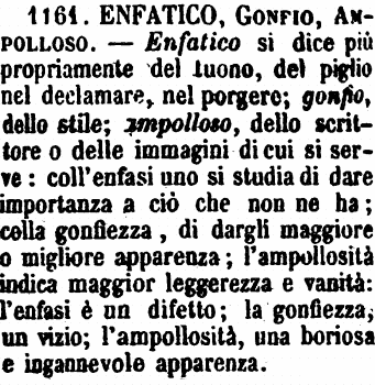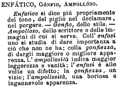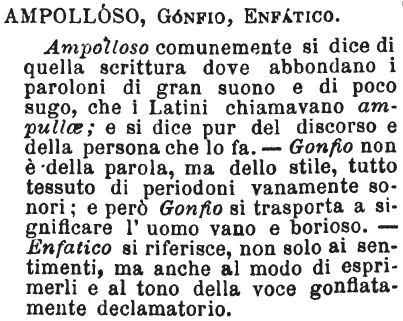 | Ampolloso, Gonfio, Enfatico - Ampolloso comunemente si dice di quella scrittura dove abbondano i paroloni di gran suono e di poco sugo, che i Latini chiamavano ampullae; e si dice pur del discorso e della persona che lo fa. - Gonfio non è della parola, ma dello stile, tutto tessuto di periodoni vanamente sonori; e però Gonfio si trasporta a significare l'uomo vano e borioso. - Enfatico si riferisce, non solo ai sentimenti, ma anche al modo di esprimerli e al tono della voce gonfiatamente declamatorio. [immagine] |