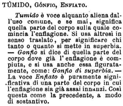 | Tumido, Gonfio, Enfiato - Tumido è voce alquanto aliena dall'uso comune, e se mai, significa quella parte del corpo sulla quale comincia l'enfiagione. Si usa altresì in senso traslato, per significare chi tanto o quanto si mette in superbia. - Gonfio si dice di quella parte del corpo dove già l'enfiagione è compiuta, e si usa anche essa figuratamente, come: Gonfio di superbia. - La voce Enfiato è puramente significativa di una parte del corpo in cui l'enfiagione sia già assai innanzi. Così questa come la precedente, a modo di sostantivo. [immagine] |