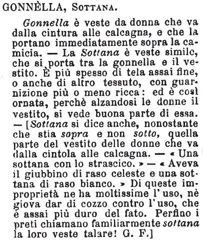| Gonnella, Sottana - Gonnella è veste da donna che va dalla cintura alle calcagna, e che la portano immediatamente sopra la camicia. - La Sottana è veste simile, che si porta tra la gonnella e il vestito. E' più spesso di tela assai fine, o anche di altro tessuto, con guarnizione più o meno ricca: ed è così ornata, perchè alzandosi le donne il vestito, si vede buona parte di essa. - [Sottana si dice anche, nonostante che stia sopra e non sotto, quella parte del vestito delle donne che va dalla cintola alle calcagna. - «Una sottana con lo strascico.» - «Aveva il giubbino di raso celeste e una sottana di raso bianco.» Di queste improprietà ne ha moltissime l'uso, nè giova dar di cozzo contro l'uso, che è assai più duro del fato. Perfino i preti chiamano familiarmente sottana la loro veste talare! G. F.] [immagine] |