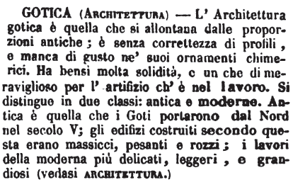 | Gotica (Architettura) - L'Architettura gotica è quella che si allontana dalle proporzioni antiche; è senza correttezza di profili, e manca di gusto ne' suoi ornamenti chimerici. Ha bensì molta solidità, e un che di meraviglioso per l'artifizio ch'è nel lavoro. Si distingue in due classi: antica e moderne. Antica è quella che i Goti portarono dal Nord nel secolo V; gli edifizi costruiti secondo questa erano massicci, pesanti e rozzi; i lavori della moderna più delicati, leggeri, e grandiosi (vedasi architettura.) [immagine] |
