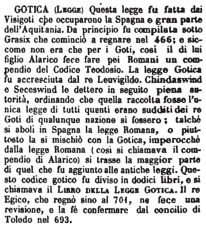 | Gotica (Legge) - Questa legge fu fatta dai Visigoti che occuparono la Spagna e gran parte dell'Aquitania. Da principio fu compilata sotto Grasix che cominciò a regnare nel 466; e siccome non era che per i Goti, così il di lui figlio Alarico fece fare pei Romani un compendio del Codice Teodosio. La legge Gotica fu accresciuta dal re Leuvigildo. Chindaswind e Seceswind le dettero in seguito piena autorità, ordinando che quella raccolta fosse l'unica legge di tutti quanti erano sudditi dei re Goti di qualunque nazione si fossero; talchè si abolì in Spagna la legge Romana, o piuttosto la si mischiò con la Gotica, imperocchè dalla legge Romana (così si chiamava il compendio di Alarico) si trasse la maggior parte di quel che fu aggiunto alle antiche leggi. Questo codice gotico fu diviso in dodici libri, e si chiamava il Libro della Legge Gotica. Il re Egico, che regnò sino al 701, ne fece una revisione, e la fè confermare dal concilio di Toledo nel 693. [immagine] |