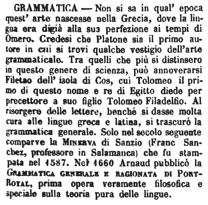 | Grammatica - Non si sa in qual'epoca quest'arte nascesse nella Grecia, dove la lingua era digià alla sua perfezione ai tempi di Omero. Credesi che Platone sia il primo autore in cui si trovi qualche vestigio dell'arte grammaticale. Tra quelli che più si distinsero in questo genere di scienza, può annoverarsi Filetao dell'isola di Cos, cui Tolomeo il primo di questo nome e re di Egitto diede per precettore a suo figlio Tolomeo Filadelfio. Al risorgere delle lettere, benchè si dasse molta cura alle lingue greca e latina, si trascurò la grammatica generale. Solo nel secolo seguente comparve la Minerva di Sanzio (Franc Sanchez, professore in Salamanca) che fu stampata nel 1587. Nel 1660 Arnaud pubblicò la Grammatica generale e ragionata di Port-Royal, prima opera veramente filosofica e speciale sulla teoria pura delle lingue. [immagine] |