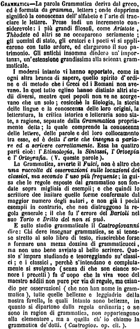 | Grammatica - La parola Grammatica deriva dal greco, ed è formata da gramma, lettera; onde dapprima significò la conoscenza dell'alfabeto e l'arte di tracciare le lettere. Prese indi un incremento considerevole: i più grandi filosofi, come Aristote, Thèodete ed altri se ne occuparono seriamente; gli uomini di stato, gli oratori e i poeti vi si applicarono con tutto ardore, ed elargarono il suo patrimonio. Gli antichi insomma diedero un'importanza, un'estensione grandissima alla scienza grammaticale.