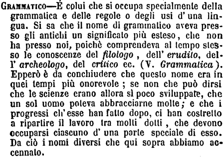 | Grammatico - [T.] Agg. V. il Sost. T. Cic. e Quintil. Arte grammatica. – Scienza, Erudizione. Quintil. Questo è piuttosto da dire cosa grammatica, quello rettorica. = Menz. Costr. irreg. 225. (C) Debbe (l'ellissi)… corrispondere alle grammatiche ragioni. Salvin. Annot. Fier. Buon. 409. (Gh.) Da plebeismi co' la debita discrizione (discrezione) si ricavano gioje di considerazioni grammatiche. Menz. Costr. Op. 3. 210. (C) Affinchè si conosca buono e ragionevolmente approvato per consuetudine, quel che per altro il rigore grammatico non consentirebbe.