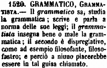 | Grammatico, Grammatista - Il grammatico sa, studia la grammatica; scrive e parla a norma delle sue leggi; il grammatista insegna bene o male la grammatica; il secondo è dispregiativo, come ad esempio filosofante, filosofastro; e perciò a niuno piacerebbe essere in tal guisa chiamato. [immagine] |
