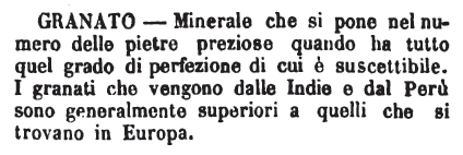 | Granato - Minerale che si pone nel numero delle pietre preziose quando ha tutto quel grado di perfezione di cui e suscettibile. I granati che vengono dalle Indie e dal Perù sono generalmente superiori a quelli che si trovano in Europa. [immagine] |