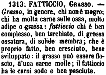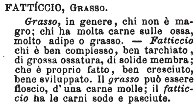 | Fatticcio, Grasso - Grasso, in genere, chi non è magro; chi ha molta carne sulle ossa, molto adipe o grasso. - Fatticcio chi è ben complesso, ben tarchiato, di grossa ossatura, di solide membra; che è proprio fatto, ben cresciuto, bene sviluppato. Il grasso può essere floscio, d'una carne molle; il fatticcio ha le carni sode e pasciute. [immagine] |