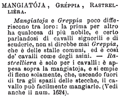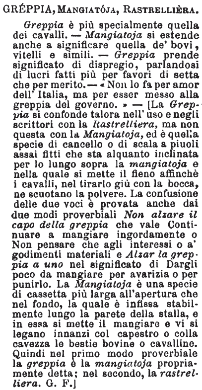 | Greppia, Mangiatoja, Rastrelliera - Greppia è più specialmente quella dei cavalli. - Mangiatoja si estende anche a significare quella de' bovi, vitelli e simili. - Greppia prende significato di dispregio, parlandosi di lucri fatti più per favori di setta che per merito. - « Non lo fa per per amor dell'Italia, ma per esser messo alla greppia del governo. » - [La Greppia si confonde talora nell'uso e negli scrittori con la Rastrelliera, ma non questa con la Mangiatoja, ed è quella specie di cancello o di scala a piuoli assai fitti che sta alquanto inclinata per lo lungo sopra la mangiatoja e nella quale si mette il fieno affinchè i cavalli, nel tirarlo giù con la bocca, ne scuotano la polvere. La confusione delle due voci è provata anche dai due modi proverbiali Non alzare il capo della greppia che vale Continua a mangiare ingordamente o Non pensare che agli interessi o a' godimenti materiali e Alzar la greppia a uno nel significato di Dargli poco da mangiare per avarizia o per punirlo. La Mangiatoja è una specie di cassetta più larga all'apertura che nel fondo, la quale è infissa stabilmente lungo la parete della stalla, e in essa si mette il mangiare e vi si legano innanzi col capestro o colla cavezza le bestie bovine o cavalline. Quindi nel primo modo proverbiale la greppia è la mangiatoja propriamente detta; nel secondo, la rastrelliera. G. F.] [immagine] |