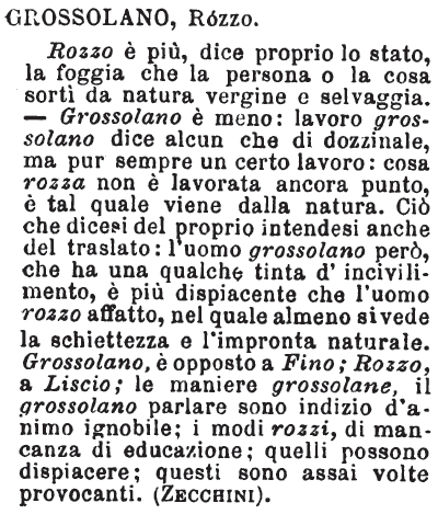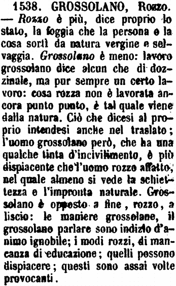 | Grossolano, Rozzo - Rozzo è più, dice proprio lo stato, la foggia che la persona e la cosa sortì da natura vergine e selvaggia. Grossolano è meno: lavoro grossolano dice alcun che di dozzinale, ma pur sempre un certo lavoro: cosa rozza non è lavorata ancora punto punto, è tal quale viene dalla natura. Ciò che dicesi al proprio intendesi anche nel traslato; l'uomo grossolano però, che ha una qualche tinta d'incivilimento, è più dispiacente che l'uomo rozzo affatto, nel quale almeno si vede la schiettezza e l'impronta naturale. Grossolano è opposto a fine, rozzo, a liscio: le maniere grossolane, il grossolano parlare sono indizio d'animo ignobile; i modi rozzi, di mancanza di educazione; quelli possono dispiacere; questi sono assai volte provocanti. [immagine] |