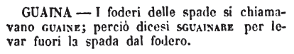 | Guaina - I foderi delle spade si chiamavano guaine; perciò dicesi sguainare per levar fuori la spada dal fodero. [immagine] |
