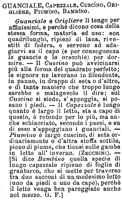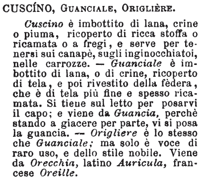 | Cuscino, Guanciale, Origliere - Cuscino è imbottito di lana, crine o piuma, ricoperto di ricca stoffa o ricamata o a fregi, e serve per tenersi sui canapè, sugli inginocchiatoi, nelle carrozze. - Guanciale è imbottito di lana, o di crine, ricoperto di tela, e poi rivestito della fèdera, che è di tela più fine e spesso ricamata. Si tiene sul letto per posarvi il capo; e viene da Guancia, perchè stando a giacere per parte, vi si posa la guancia. - Origliere è lo stesso che Guanciale; ma solo è voce di raro uso, e dello stile nobile. Viene da Orecchia, latino Auricula, francese Oreille. [immagine] |