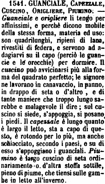 | Guanciale, Capezzale, Cuscino, Origliere, Piumino - Guanciale e origliere li tengo per affinissimi, e perchè dicono mobile della stessa forma, materia ed uso: son quadrilunghi, ripieni di lana, rivestiti di federa, e servono ad adagiarvi su il capo (perciò le guancie e le orecchie) per dormire. Il cuscino può avvicinarsi più alla forma del quadrato perfetto; le signore ne lavorano in canavaccio, in panno, in drappo di seta o d'altro, e di tante maniere che troppo lungo sarebbe e malagevole il dire; sul cuscino si siede, s'appoggia, si posano i piedi. Il capezzale è lungo quanto è largo il letto, sta a capo di questo, è rotondo per lo più, ma anche schiacciato, secondo i paesi, e su di esso s'appoggiano i guanciali. Piumino è largo cuscino in seta ordinariamente o d'altra stoffa sottile, pieno di piume, che tiensi sulle gambe in letto all'inverno. [immagine] |