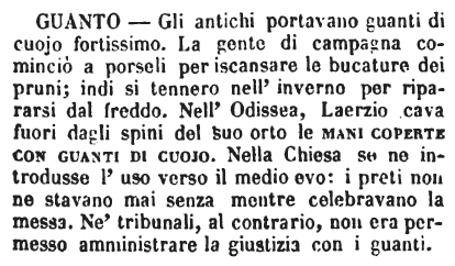 | Guanto - Gli antichi portavano guanti di cuojo fortissimo. La gente di campagna cominciò a porseli per iscansare le bucature dei pruni; indi si tennero nell'inverno per ripararsi dal freddo. Nell'Odissea, Laerzio cava fuori dagli spini del suo orto le mani coperte con guanti di cuojo. Nella Chiesa se ne introdusse l'uso verso il medio evo: i preti non ne stavano mai senza mentre celebravano la messa. Ne' tribunali, al contrario, non era permesso amministrare la giustizia con in guanti. [immagine] |