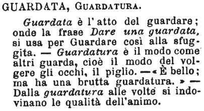 | Occhiata, Guardata, Occhiataccia - Occhiata è sguardo furtivo gettato a disegno. - «Gli dava certe occhiate, che svelavano l'animo suo.» - Quando invece l'occhiata è significativa di odio, disprezzo, o simili, allora è occhiataccia. - La Guardata è l'atto della vista che si ferma sopra un oggetto tanto tempo quanto basta a conoscerne la qualità. [immagine] |
