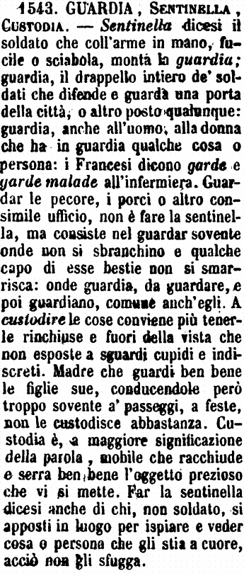| Guardia, Sentinella, Custodia - Sentinella dicesi il soldato che coll'arme in mano, fucile o sciabola, monta la guardia; guardia, il drappello intiero de' soldati che difende e guarda una porta della città, o altro posto qualunque: guardia, anche all'uomo, alla donna che ha in guardia qualche cosa o persona: i Francesi dicono garde e garde malade all'infermiera. Guardar le pecore, i porci o altro consimile ufficio, non è fare la sentinella, ma consiste nel guardar sovente onde non si sbranchino e qualche capo di esse bestie non si smarrisca: onde guardia, da guardare, e poi guardiano, comune anch'egli. A custodire le cose conviene più tenerle rinchiuse e fuori della vista che non esposte a sguardi cupidi e indiscreti. Madre che guardi ben bene le figlie sue, conducendole però troppo sovente a' passeggi, a feste, non le custodisce abbastanza. Custodia è, a maggiore significazione della parola, mobile che racchiude e serra ben bene l'oggetto prezioso che vi si mette. Far la sentinella dicesi anche di chi, non soldato, si apposti in luogo per ispiare e veder cosa o persona che gli stia a cuore, acciò non gli sfugga. [immagine] |