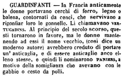 | Guardinfanti - In Francia anticamente le donne portavano cerchi di ferro, legno o balena, contornati da cenci, che servivano a rigonfiar loro le gonnelle. Li chiamavano vertugadins. Al principio del secolo scorso, questi tornarono in favore, ma le donne mantenendo ad essi il nome vecchio, (cosi dice un moderno autore) avrebbero creduto di portare un'anticaglia, e di essere anticaglie anco elleno stesse, e quindi li nominarono paniers, a motivo della somiglianza che avevano con le gabbie o ceste da polli. [immagine] |