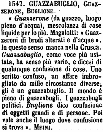 | Guazzabuglio, Guazzerone, Buglione - «Guazzerone (da guazzo, luogo pieno d'acqua), mescolanza di cose liquide per lo più. Magalotti: «Guazzeroni di brodi alterati e d'acque». In questo senso manca nella Crusca. Guazzabuglio, come voce più usitata, ha senso più vario, e dicesi di qualunque confusione di cose. Uno scritto confuso, un affare imbrogliato da mille circostanze diverse, gli è un guazzabuglio. Il mondo è pieno di guazzabugli. I guazzabugli politici. Buglione dice confusione di oggetti grandi e di persone. Poi vale anche il luogo dove confusione si trova». Meini. [immagine] |