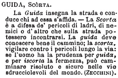 | Guida, Scorta - La guida insegna la strada e conduce chi ad essa s'affida. La scorta è a difesa de' pericoli di ladri, di nemici o d'altro che sulla strada potessero incontrarsi: la guida deve conoscere bene il cammino, la scorta vigilare contro i pericoli lungo la via: se l'uomo ha la prudenza per guida e per iscorta la fermezza, può camminare risoluto e sicuro nelle vie sdrucciolevoli del mondo. [immagine] |