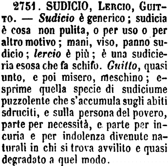 | Sudicio, Lercio, Guitto - Sudicio è generico; sudicia è cosa non pulita, o per uso o per altro motivo; mani, viso, panno sudicio; lercio è più; è una sudicieria esosa che fa schifo. Guitto, quasi unto, e poi misero, meschino; esprime quella specie di sudiciume puzzolente che s'accumula sugli abiti sdruciti, e sulla persona del povero, parte per necessità, e parte per incuria e per indolenza divenute naturali in chi si trova avvilito e quasi degradato a quel modo. [immagine] |