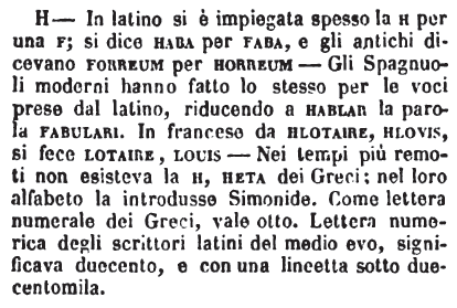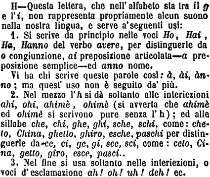 | H - Questa lettera, che nell'alfabeto sta tra il g e l'i, non rappresenta propriamente alcun suono nella nostra lingua, e serve a' seguenti usi: