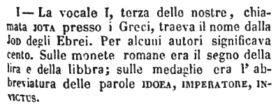 I - La vocale I, terza delle nostre, chiamata jota presso i Greci, traeva il nome dalla jod degli Ebrei. Per alcuni autori significava cento. Sulle monete romane era il segno della lira e della libbra; sulle medaglie era l'abbreviatura delle parole idoea, imperatore, invictus. [immagine]
