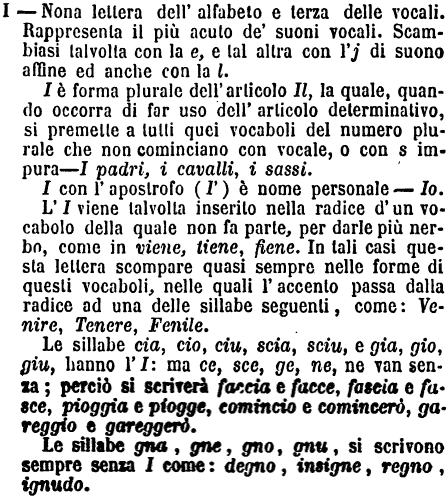 I - Nona lettera dell'alfabeto e terza delle vocali. Rappresenta il più acuto de' suoni vocali. Scambiasi talvolta con la e, e tal altra con l'j di suono affine ed anche con la l.