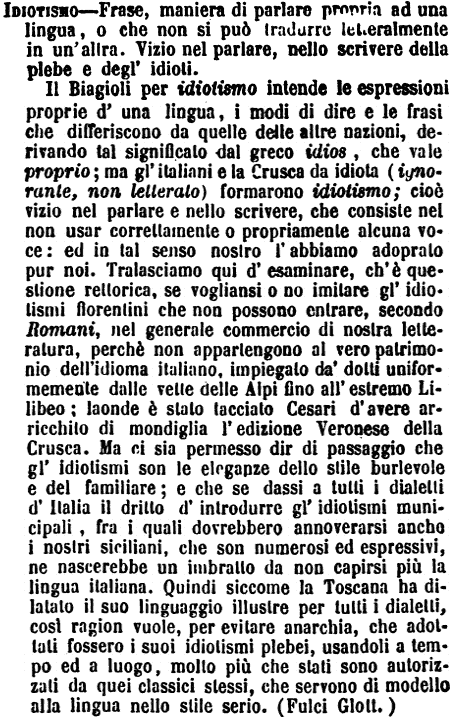 Il Biagioli per idiotismo intende le espressioni proprie d'una lingua, i modi di dire e le frasi che differiscono da quelle delle altre nazioni, derivando tal significato dal greco idios, che vale proprio; ma gl'italiani e la Crusca da idiota (ignorante, non letterato) formarono idiotismo; cioè vizio nel parlare e nello scrivere, che consiste nel non usar correttamente o propriamente alcuna voce: ed in tal senso nostro l'abbiamo adoprato pur noi. Tralasciamo qui d'esaminare, ch'è questione rettorica, se vogliansi o no imitare gl'idiotismi fiorentini che non possono entrare, secondo Romani, nel generale commercio di nostra letteratura, perchè non appartengono al vero patrimonio dell'idioma italiano, impiegato da' dotti uniformemente dalle vette delle Alpi fino all'estremo Lilibeo; laonde è stato tacciato Cesari d'avere arricchito di mondiglia l'edizione Veronese della Crusca. Ma ci sia permesso dir di passaggio che gl'idiotismi son le eleganze dello stile burlevole e del familiare; e che se dassi a tutti i dialetti d'Italia il dritto d'introdurre gl'idiotismi municipali, fra i quali dovrebbero annoverarsi anche i nostri siciliani, che son numerosi ed espressivi, ne nascerebbe un imbratto da non capirsi più la lingua italiana. Quindi siccome la Toscana ha dilatato il suo linguaggio illustre per tutti i dialetti, così ragion vuole, per evitare anarchia, che adottati fossero i suoi idiotismi plebei, usandoli a tempo ed a luogo, molto più che stati sono autorizzati da quei classici stessi, che servono di modello alla lingua nello stile serio. (Fulci Glott.) [immagine] |