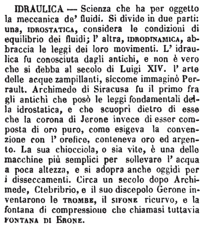 | Idraulica - Scienza che ha per oggetto la meccanica de' fluidi. Si divide in due parti: una, idrostatica, considera le condizioni di equilibrio dei fluidi; l'altra, idrodinamica, abbraccia le leggi dei loro movimenti. L'idraulica fu conosciuta dagli antichi, e non è vero che si debba al secolo di Luigi XIV. l'arte delle acque zampillanti, siccome immaginò Perrault. Archimede di Siracusa fu il primo fra gli antichi che posò le leggi fondamentali della idrostatica, e che scuoprì dietro di esse che la corona di Jerone invece di essere composta di oro puro, come esigeva la convenzione con l'orefice, conteneva oro ed argento. La sua chiocciola, o sia vite, è una delle macchine più semplici per sollevare l'acqua a poca altezza, e si adopra anche oggidi per i disseccamenti. Circa un secolo dopo Archimede, Ctebribrio, e il suo discepolo Gerone inventarono le trombe, il sifone ricurvo, e la fontana di compressione che chiamasi tuttavia fontana di Erone. [immagine] |