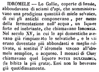 | Idromele - Le Gallie, coperte di foreste, abbondavano di sciami d'api, che somministravano una prodigiosa quantità di miele selvatico, di cui gli antichi componevano, per mezzo della fermentazione nell'acqua, un liquore forte ed inebriante, che chiamavano Idromele. Nel secolo XV, in cui le api domestiche avevano già rimpiazzato le selvatiche, e le viti erano doventate più abbondanti e meglio coltivate, si sostituì l'idromele vinoso all'idromele semplice, o acquoso. I monaci di Cluny chiamavano quel liquore potus dulcissimus, (la bibita la più grata). Essi non lo bevevano già quotidianamente. [immagine] |