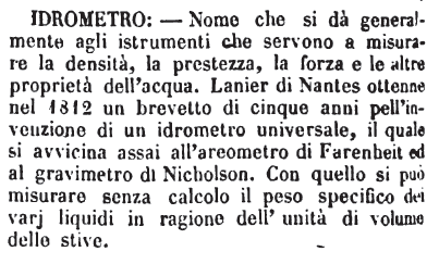 | Idrometro - Nome che si dà generalmente agli istrumenti che servono a misurare la densità, la prestezza, la forza e le altre proprietà dell'acqua. Lanier di Nantes ottenne nel 1812 un brevetto di cinque anni pell'invenzione di un idrometro universale, il quale si avvicina assai all'areometro di Farenheit ed al gravimetro di Nicholson. Con quello si può misurare senza calcolo il peso specifico dei varj liquidi in ragione dell'unità di volume delle stive. [immagine] |